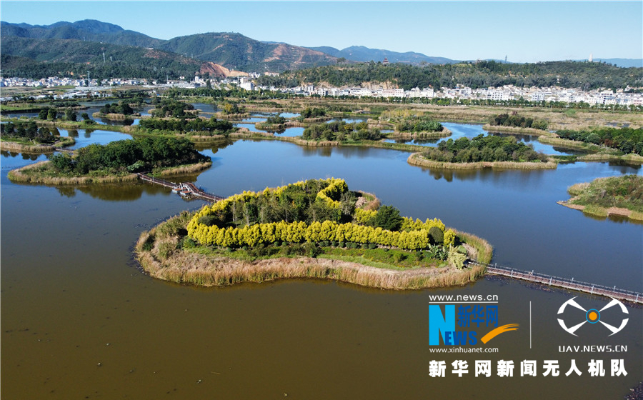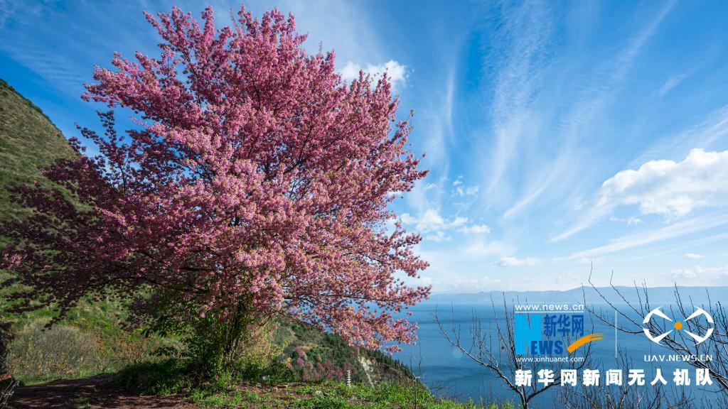 紅花依碧水,仙湖早爭春。在北方正冰天雪地的時候,云南澄江撫仙湖畔卻紅翠相染,山花爛漫,依舊溫暖如春。冬櫻花與綠樹、藍天、碧水,共同構成一幅色彩斑斕的山水畫卷。