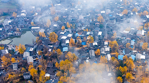 在云南省騰沖市固東鎮,冬日里的“銀杏村”,云霧繚繞,金色銀杏樹與村落交相輝映,一條條道路變成“金色大道”,吸引了不少游客前來拍照留念。