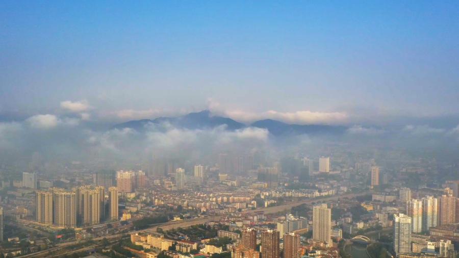 近日,懷化市鶴城區出現了平流霧自然現象,城市被氤氳的霧氣環繞,仿佛披上了一層薄紗,猶如一座“天空之城”。