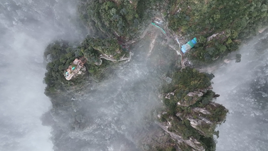 張家界永定區七星山的莽莽群山銀裝素裹,云霧在雄奇險峻的山峰之間纏繞升騰,雪鋪陳在巨大雄渾的臺型地貌上,猶如漫無邊際的白色綢緞,整個七星山就像一幅奇幻風格的CG插畫,讓人震撼。