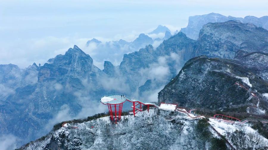1月6日,湖南省張家界市迎來新年第一場雪。在海拔1500多米的天門山上大雪紛飛,讓雄奇的群峰披上了銀裝。遠處的云氣纏繞在墨色的群山間,近處的樹枝被霧凇染白了頭。行走在這如水墨畫般的風景中,宛若置身仙境。(蘇崢嶸 覃少波 邵穎 丁文國)